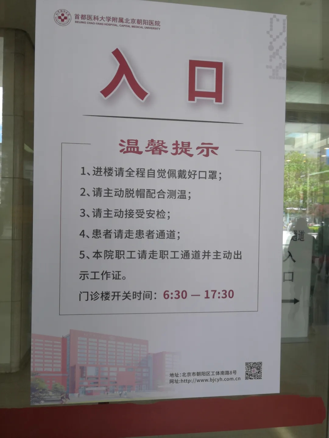除了上述入口,在医院门诊楼东门等入口处,也各有安保人员和医护人员负责测温、安检工作。除了安检门之外,带包患者可以直接将包放进安检闸机过检,安保人员盯着安检闸机屏幕监测有无异常状况;另一名身着白大褂的医护人员则盯着电脑屏幕上的画面。在朝阳医院门诊楼东门等医院多个角落,都张贴了需要安检的“温馨提示”。其中一则入口温馨提示上,第3条内容是“请主动接受安检。”